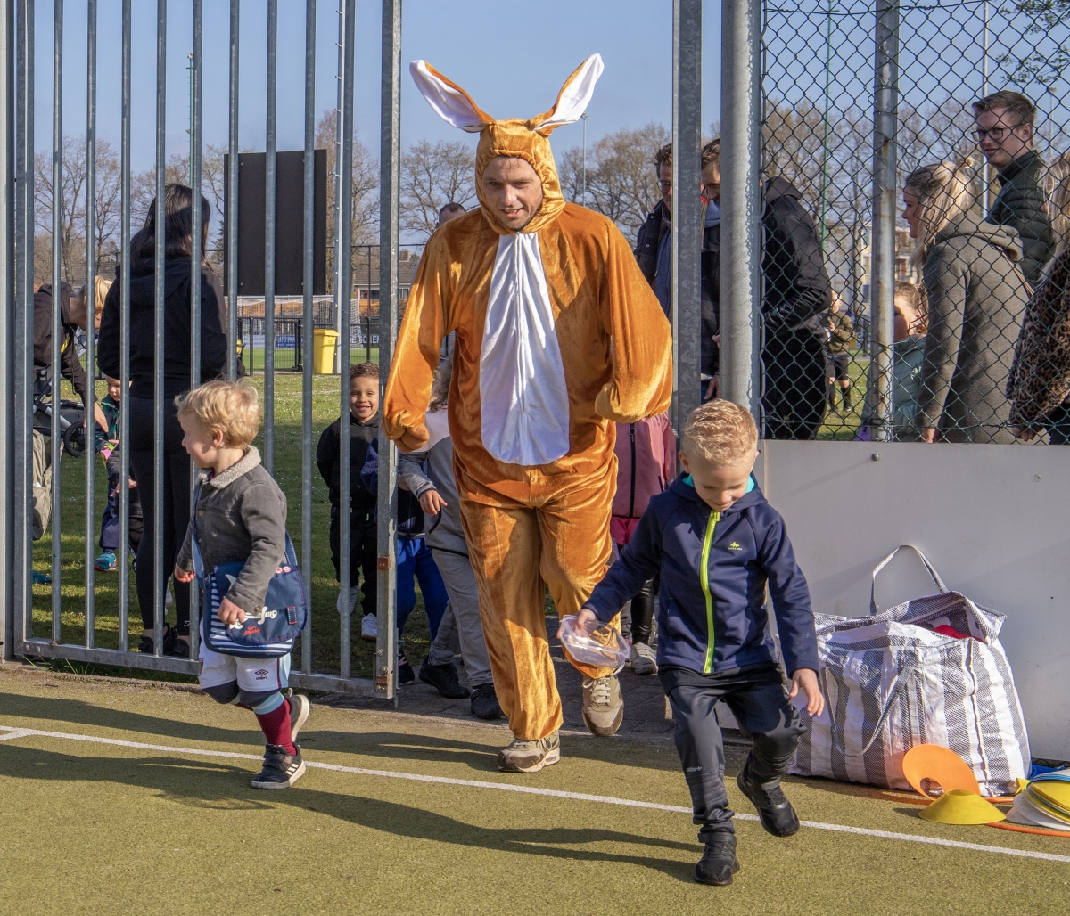Heerlijk enthousiast renden de kinderen over het veld en werd in alle hoeken en gaten gretig gezocht. Ook de paashaas zelf hielp de kinderen mee. Toen alle eitjes gevonden waren, was het tijd om lekker te voetballen. Dus de gevonden waar mocht even aan de kant worden gezet. Dribbeloefeningen, partijspel en penalty’s nemen met de paashaas, het werd allemaal nog heel goed gedaan.