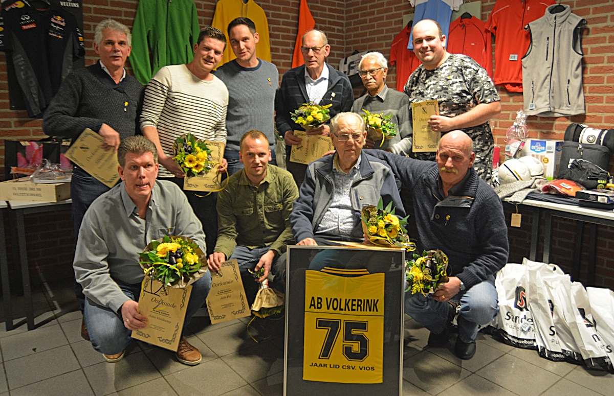 John Veldkamp was 40 jaar lid en 4 leden kregen de speld en de oorkonde voor 50 jaar lidmaatschap.Te weten: Gert Stijf – Ep van den Berg – Reinier Berghuis – Pieter Pelamonia. Daarna was het de beurt aan Aart Kamphuis die maar liefst 60 jaar verbonden is aan de club en nog steeds actief is in de schoonmaakploeg en de ontspanningscommissie. Record houder van de avond was Ab Volkerink die maar liefst 75 jaar aan vios is verbonden. Hij kreeg voor dit rhodium jubileum een ingelijst vios shirt met het nummer 75. De jubilarissen kregen in dichtvorm van de voorzitter alle eer toegezwaaid en met een bos bloemen werden de jubilarissen nog eens bedankt voor hun jarenlange verenigingstrouw.