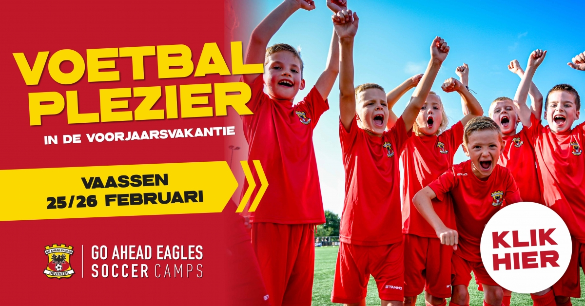 Na het succes van vorig jaar keert Go Ahead Eagles ook in 2025 terug bij c.s.v. VIOS Vaassen. Dinsdag 25 en woensdag 26 februari 2025, dagelijks van 9:00 – 15:00 uur, zullen volledig in het teken staan van de Go Ahead Eagles Soccer Camps. Houdt jouw zoon/dochter van voetballen en plezier maken? Dan zijn onze actieve voetbaldagen de perfecte activiteit in de voorjaarsvakantie. Meld je hier aan voor een onvergetelijke voetbalervaring!