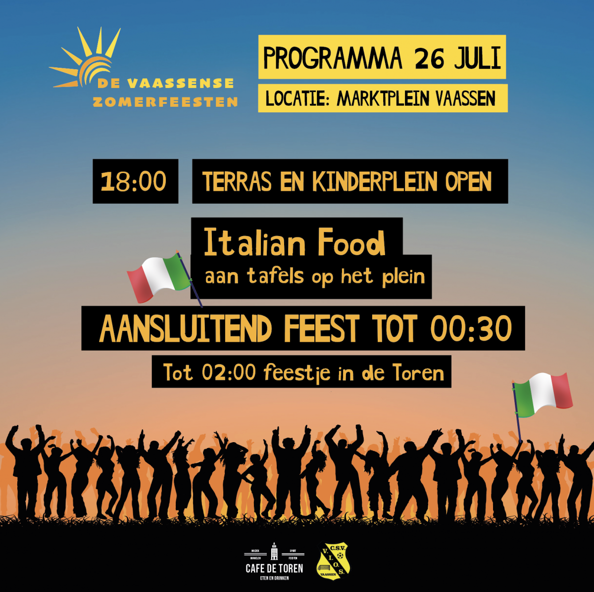 Woensdag 26 juli staat het tweede Vaassense Zomerfeest op het programma, na de succesvolle eerste editie staat de avond nu in het teken van de Italiaanse gezelligheid. We starten de avond om 18.00 uur, het besluit om iets later te starten heeft de organisatie de vorige keer door de slechte weersomstandigheden moeten maken en is goed bevallen.
