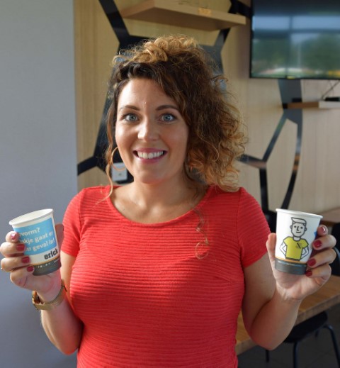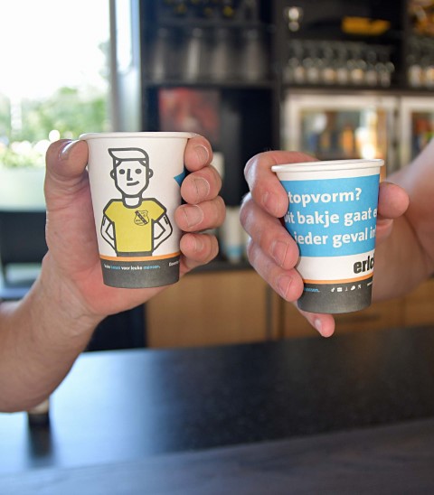 Carmen van Mossel vestigingsmanager is het aanspreekpunt in Vaassen. We wilden ons plastic afval verminderen en kwamen zo samen met Ludo, overigens ook oud Vios speler, op het idee om papieren bekers te gebruiken als sponsor medium.
