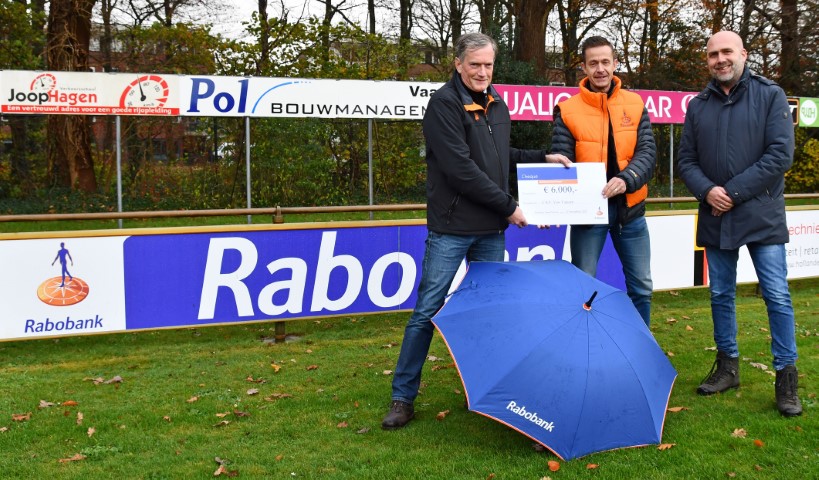 Op zaterdag 27 november hebben we uit handen van René Steunenberg namens de Rabobank een cheque van € 6.000,- in ontvangst mogen nemen als bijdrage in de kosten voor het verduurzamen van de veldverlichting op ons sportpark.