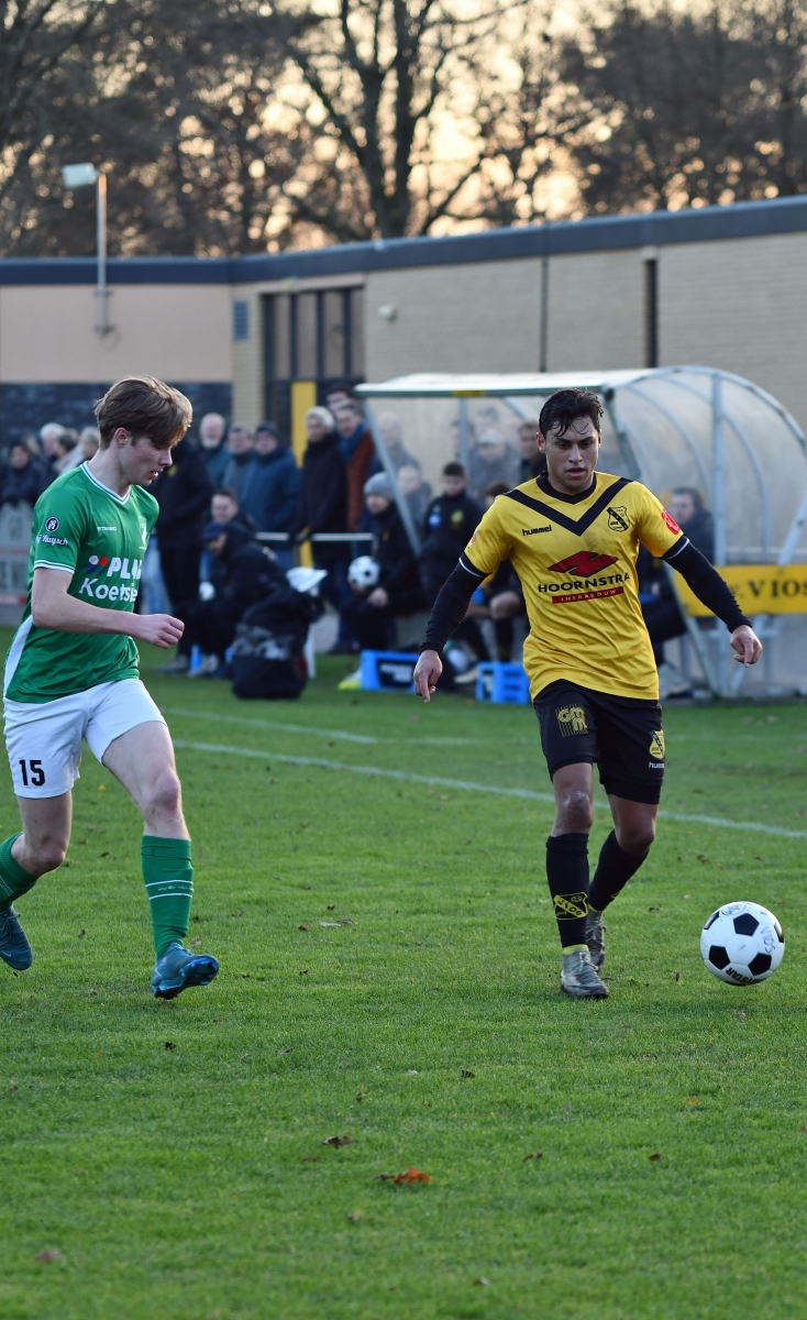Met Mensink in de ploeg krijgt VIOS op de valreep nog een strafschop in het eerste bedrijf. Charges in het strafschopgebied op achtereenvolgens Kristiaan Bax en Jaron Dijksterhuis zijn voor scheidsrechter Van de Brug voldoende om de bal op de stip te leggen. Noah Tuasela kiest in een ander doel voor dezelfde hoek als tegen AGOVV en zet zijn ploeg niet geheel onverdiend op een 1 – 0 voorsprong.
