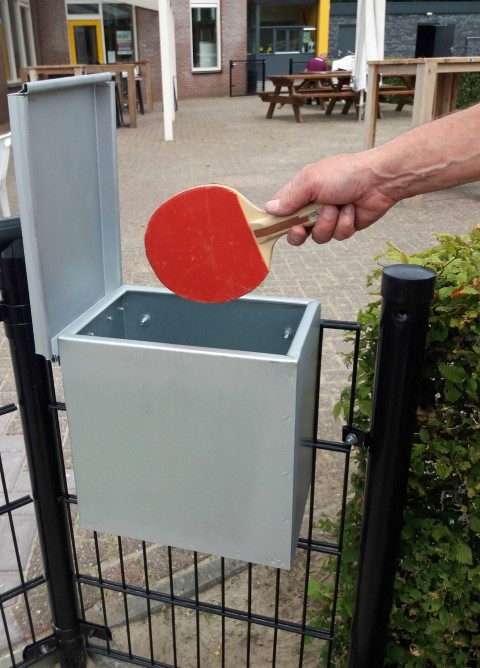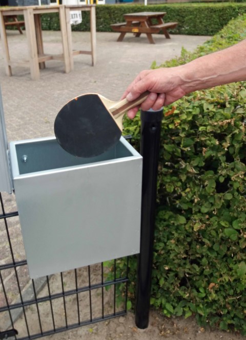 Het is zover bij de Tennistafel hangt nu een kastje waar 2 batjes en 4 balletjes in liggen.