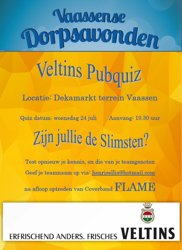 Op woensdag 24 juli organiseren we weer de jaarlijkse Veltins Pubquiz. Na meerdere eerdere succesvolle edities ook dit jaar weer een nieuwe strijd om de felbegeerde (nieuwe) wisselbokaal.