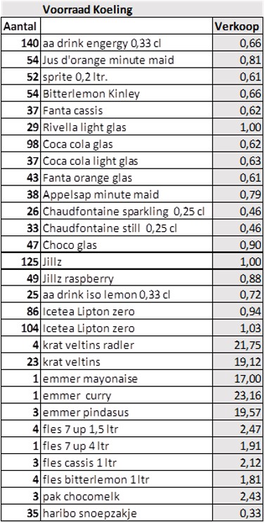 Als gevolg van de coronacrisis heeft de kantinecommissie besloten om de voorraad in de kantine aan de leden of andere belangstellenden te verkopen. Van de meeste producten verloopt de houdbaarheidsdatum in de zomer en het lijkt uitgesloten dat de kantine voor de zomerstop nog geopend mag worden. De kantinecommissie heeft daarom de voorraad in kaart gebracht en in de onderstaande tabel op een rijtje gezet. De verkoop start per heden.