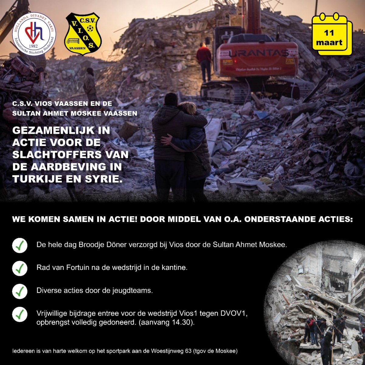 Op de accommodatie van Vios aan de woestijnweg 63 (tegenover de Moskee), worden verschillende acties georganiseerd om een mooie bedrag bijeen te brengen. De Islamitische stichting Nederland zorgt dat de volledige opbrengst ten goede komt aan de hulp voor de slachtoffers.