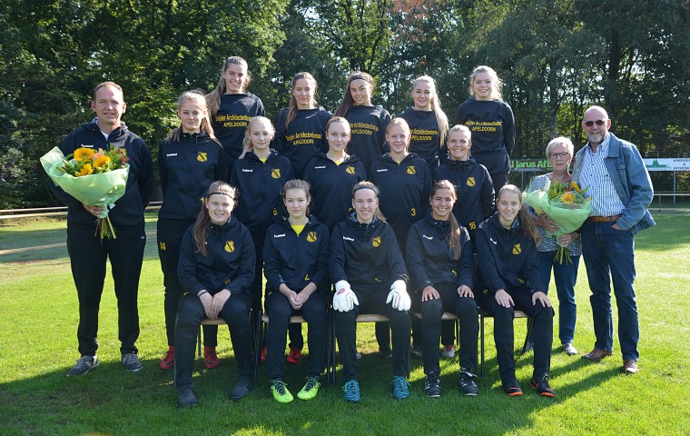 Zaterdagmorgen werden de meiden van Vios MO17-1 door Architectenbureau Snijder en hun trainer Ronald Snijder verblijd met nieuwe trainingspakken en tassen.