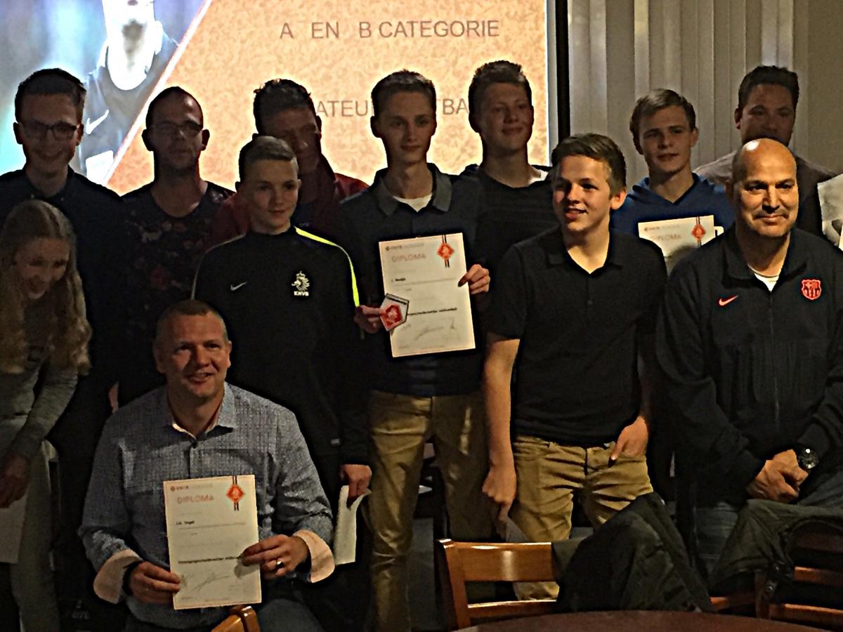 De terug koppeling van deze wedstrijden werden gegeven op de cursus avonden (en deze waren niet misselijk). Ook kregen ze het spelregelboek van de KNVB die ook even uit het hoofd geleed moest worden. En dit allemaal naast je eigen werk of schoolopleiding. Maar met een geweldig resultaat mochten de heren afgelopen dinsdag het wel verdiende diploma in ontvangst nemen. Van uit de KNVB kregen ze een diploma en het vignet voor op het shirt. Vanuit de vereniging werden ze beloond met een scheidsrechter uitrusting (Kaarten, fluit, tosmuntje, horloge en dit allemaal in een net tasje)