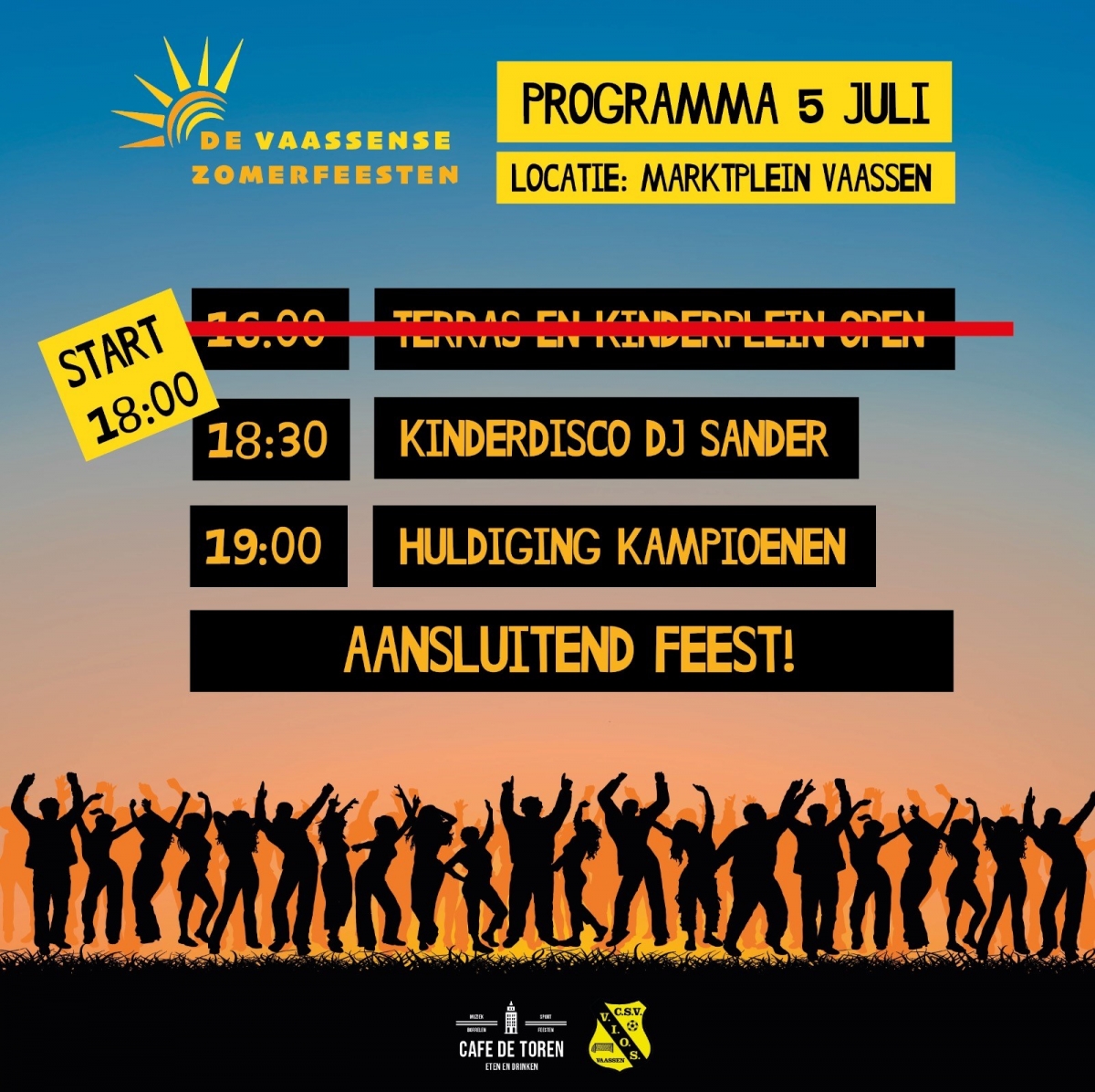 In verband met de weersomstandigheden start het Zomerfeest vandaag om 18.00 uur! Met om 18.30 uur de kinderdisco, 19.00 uur de huldiging van de kampioenen met daarna aansluitend feest!
